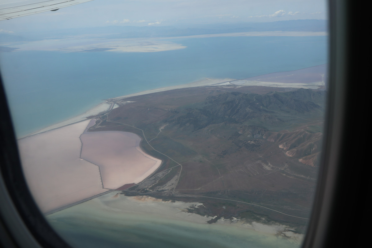 快到盐湖城的时候从飞机上看到了“盐湖”,相机有限加上玻璃比较脏,无法拍出眼睛看到的色彩,肉眼看起来真的是非常的壮观,而且不同的部分有不同的颜色,之间还有清晰的界限。